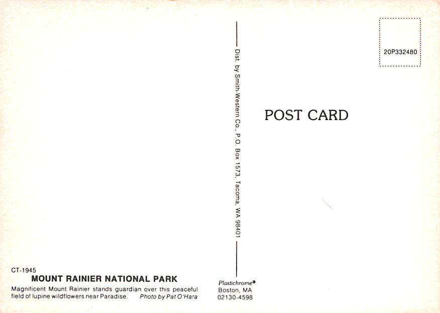 Mount Rainier National Park - Washington Grade: 1 Category: Continental Size Postcard, Approx 4 in x 6 in (10 cm x 15.25 cm) Product Size: Continental size: 4X6 inches (10.5 cm x 15 cm) Grading Scale: Grade 1 ... Read More