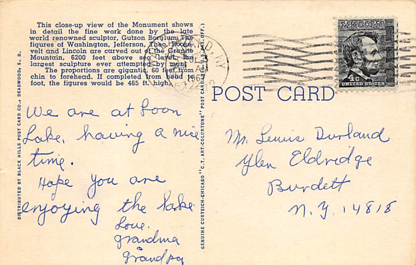 Mount Rushmore National Monument Black Hills SD Grade: 2 Size: Regular Size Postcard - approximately 3 1/2 inch x 5 1/2 inch (9 CM x 14 CM) Grading Scale: Grade 1 = Perfect corners Grade 2 = Very Minimal corner ... Read More