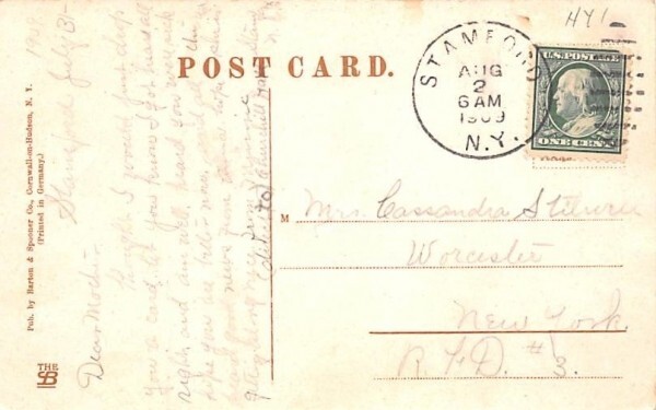 Mount Utsayantha in Stamford, New York Postcard - 1909 Grade: 1 light postal marking on front Size: R - Regular size: Approx 3 1/2 X 5 1/2 inch (9 cm X 14 cm) Grading Scale: Grade 1 = Perfect corners Grade 2 = ... Read More