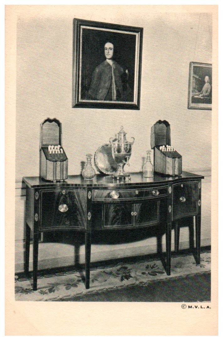 This vintage postcard features the original sideboard from Mount Vernon, along with George Washington's portrait of his elder half-brother, Lawrence, from whom he inherited Mount Vernon. It is part of the Mount Vern ... Read More