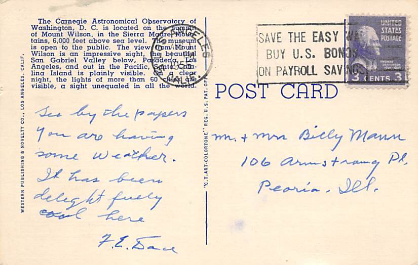 Mount Wilson Observatory CA, USA Space Postcard PU Unknown, Grade: 2, , Size: Regular size: Approx 3 1/2 X 5 1/2 inch (9 cm X 14 cm) Grading Scale: Grade 1 = Perfect corners Grade 2 = Very Minimal corner wear, ... Read More