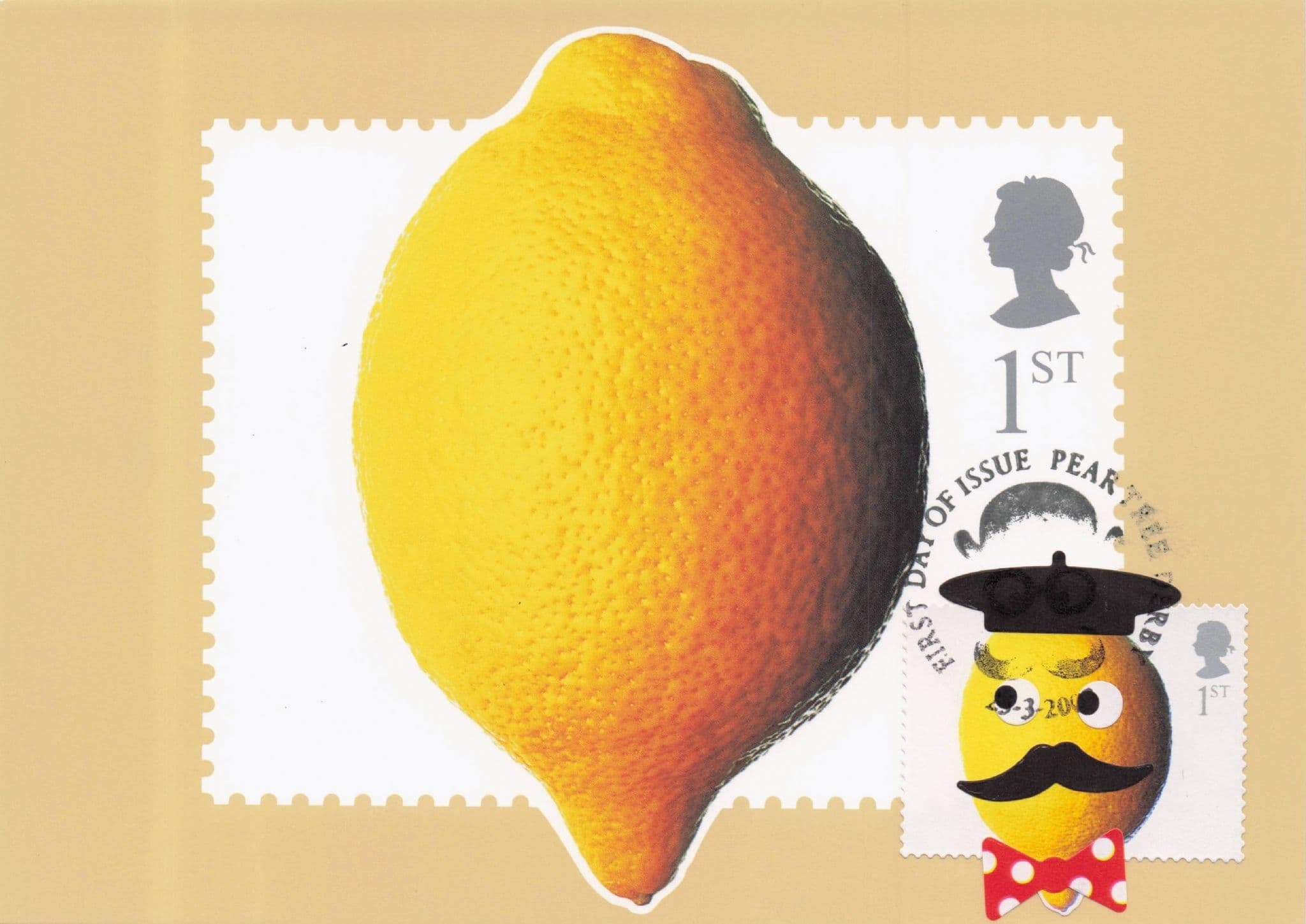 NP75 A stunning postcard from circa 20+ years ago and official Royal Mail card of this Mr Lemon fruit man with giant eyes grinning and fashion hat come to life which was chosen by Royal Mail to be issued as a stamp with brief details on reverse of its design and creation etc being a limited edition collectors souvenir from 2003 & whilst an address written on reverse is postally unused and mint condition (note this has the limited edition stamp on the front with accompanying first day of release commemorative postmark not found on others)