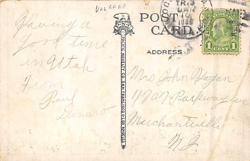 Mt. Lassen Eruption CA Postcard - 1935 Grade: 5 Size: R - Regular size: Approx 3 1/2 X 5 1/2 inch (9 cm X 14 cm) Grading Scale: Grade 1 = Perfect corners Grade 2 = Very Minimal corner wear, no creases Grade 3 ... Read More