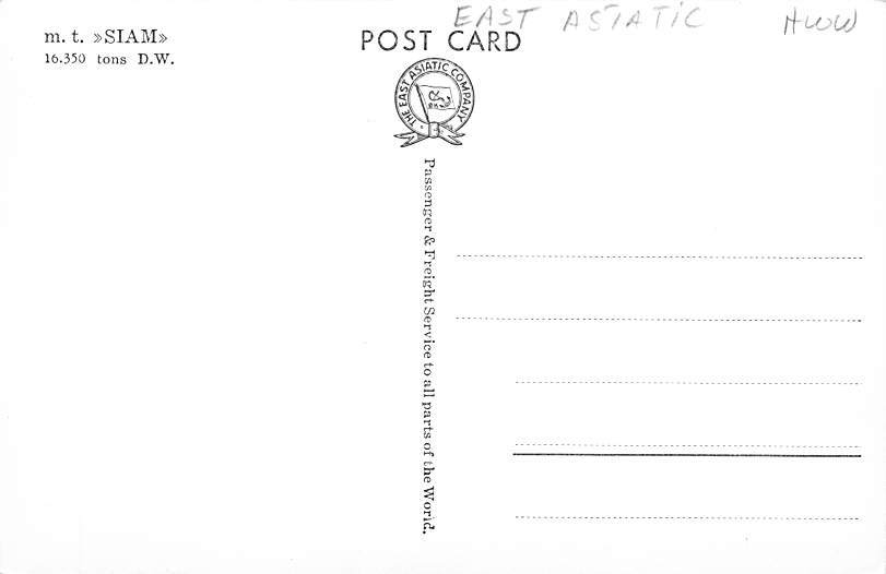 MT Siam East Asiatic Ship Postcard Unused, Grade: 1 - real photo Size: Regular Size Postcard - approximately 3 1/2 inch x 5 1/2 inch (9 CM x 14 CM) Grading Scale: Grade 1 = Perfect corners Grade 2 = Very Minima ... Read More