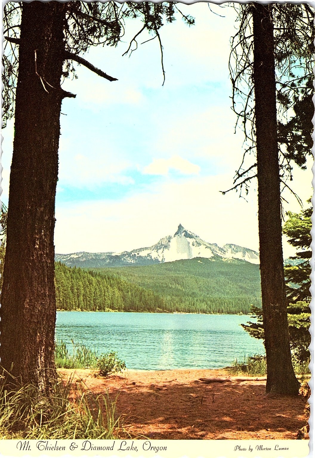 This vintage postcard features a stunning lithograph image of Mt. Thielsen overlooking Diamond Lake, located in Oregon. The scenic view captures the rugged peak of Mt. Thielsen framed naturally by tall trees with the tranquil waters of Diamond Lake in the foreground. Known for its picturesque landscapes and popular fishing resort, Diamond Lake is a treasured national destination showcased beautifully here.Produced by Dexter Press, a well-known publisher based in West Nyack, New York, this postcard is a licensed reprint from the photochrome era (1939-present), specifically from the 1960s. The card measures a continental size of 6 x 4 inches, with scalloped edges typical of mid-20th century postcards. Its detailed color printing and chrome finish highlight the natural beauty and vibrant colors of the Oregon wilderness. The back includes publisher information from Smith Western Inc., Portland, Oregon, adding to its collectible appeal.