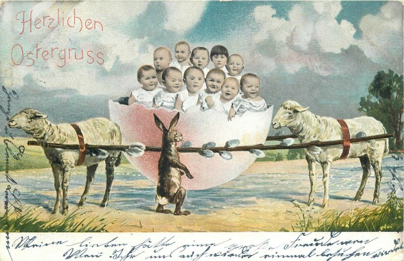 Multi babies surrealism Easter egg lamb cart & rabbit fantasy postcard c.1905
