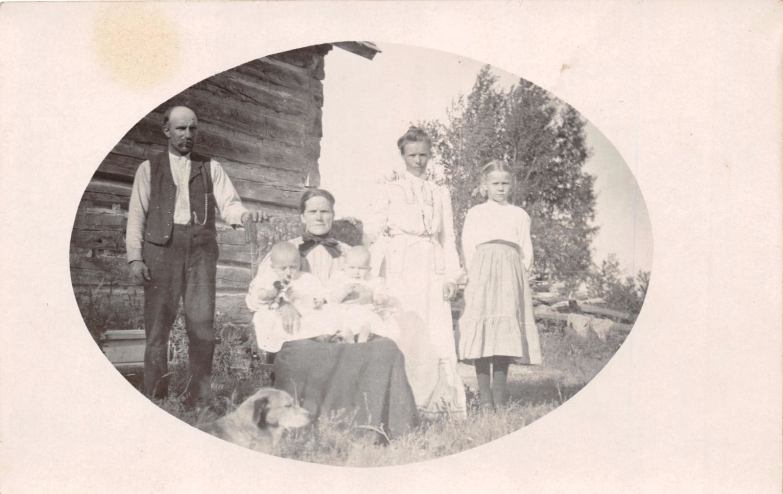 MULTI GENERATIONS + DOG~LOG CABIN~OVAL REAL PHOTO POSTCARD 1910s~MOST LIKELY MN