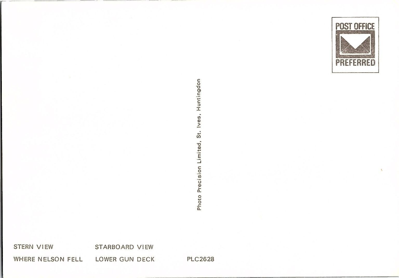 This vintage postcard features the iconic H.M.S. Victory, the famed British Royal Navy ship known for its role in the Battle of Trafalgar. Presented in a multi-view format, the card highlights detailed views of the ship's stern, starboard side, and the lower gun deck where Admiral Nelson fell, capturing the historic naval vessel from multiple angles. The vibrant photochrome printing technique brings rich color and sharp details, typical of postcards produced from the late 1930s onward.Printed by Photo Precision Limited, St. Ives, Huntingdon, this postcard was manufactured during the 1960s and measures a continental size of 6 x 4 inches. The card is an official licensed reprint, making it a collectible piece for maritime enthusiasts and postcard collectors alike. The imagery beautifully showcases the intricate rigging, deck features, and the ship's iconic design, embodying a significant piece of naval history and British heritage. Perfect for collectors interested in historic ships, naval history, or vintage photography.