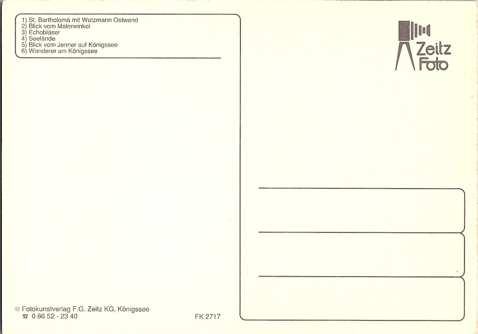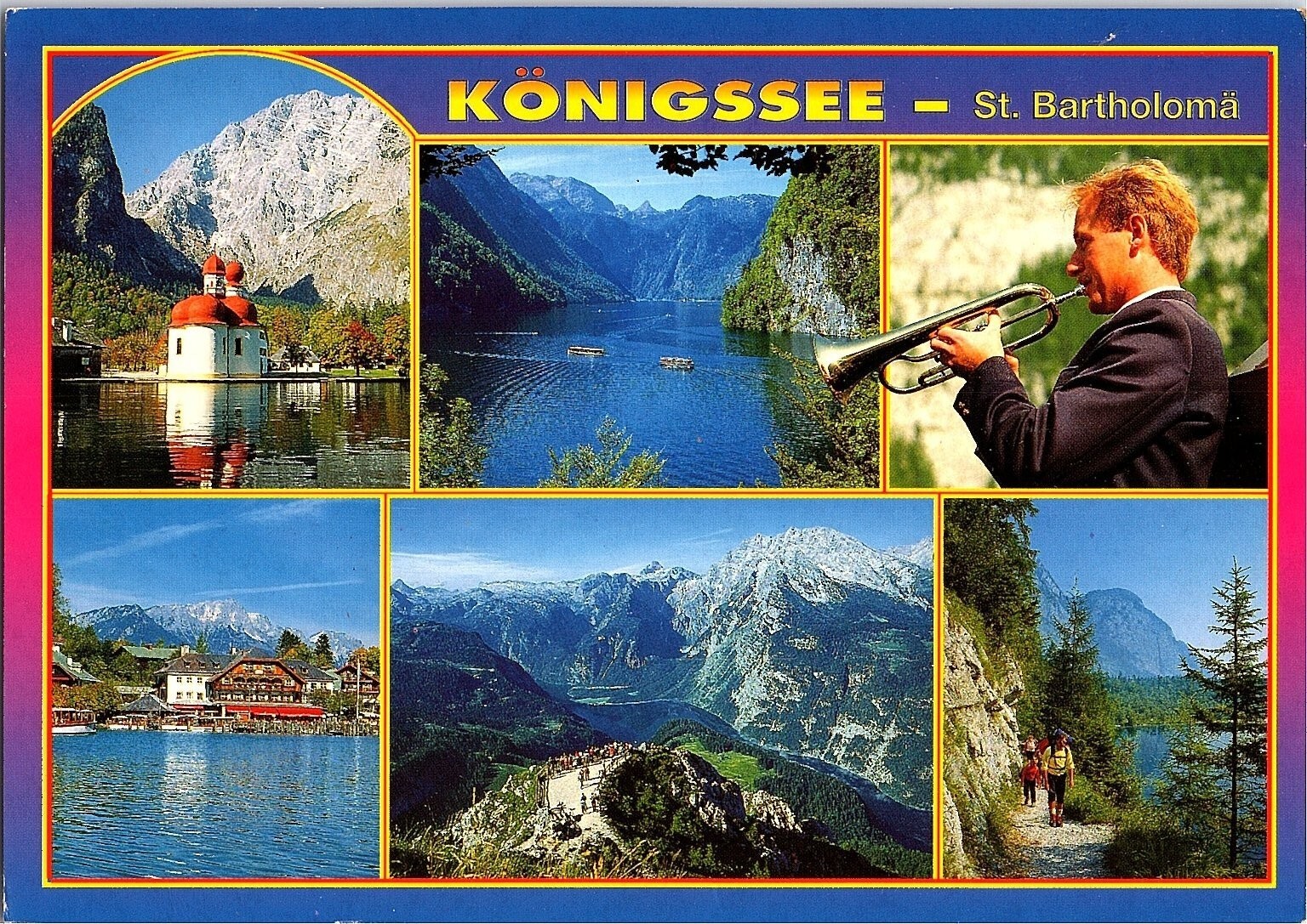 This vibrant multi-view postcard showcases the breathtaking scenery of Königssee, Germany, featuring the iconic St. Bartholomä Church surrounded by the stunning Watzmann mountain range. Produced by Fotokunstverlag F.G. Zeitz KG, this chrome postcard captures six distinct images including a man playing an Echobläser (echo trumpet), hikers at Königssee, and panoramic lake views from Malerwinkel and Jenner peaks. The bright lithographic printing technique combined with photochrome colorization vividly preserves the natural beauty and cultural heritage of this Alpine region.Dating from the 1960s, this continental-sized postcard (6 x 4 inches) is a licensed reprint by Zeitz Foto, known for their quality photographic postcards. The back of the card lists all featured views in German and includes the publisher's contact details, enhancing its collectible appeal. A perfect item for postcard collectors, travelers, and admirers of German landscapes, this piece offers a nostalgic glimpse into one of Bavaria's most picturesque tourist destinations.