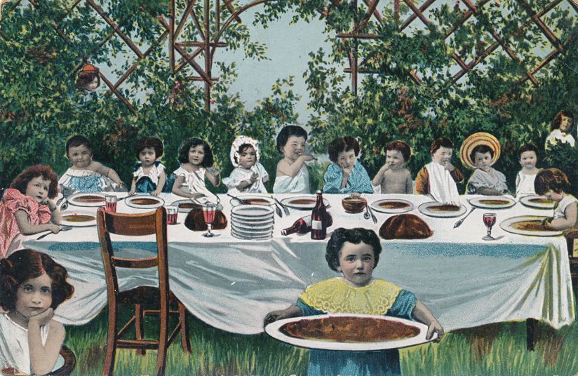 Multiple Babies Greetings - Fancy Outdoor Dinner Party.Undivided Back Post Card Era - Presumed from 1907 or earlier.