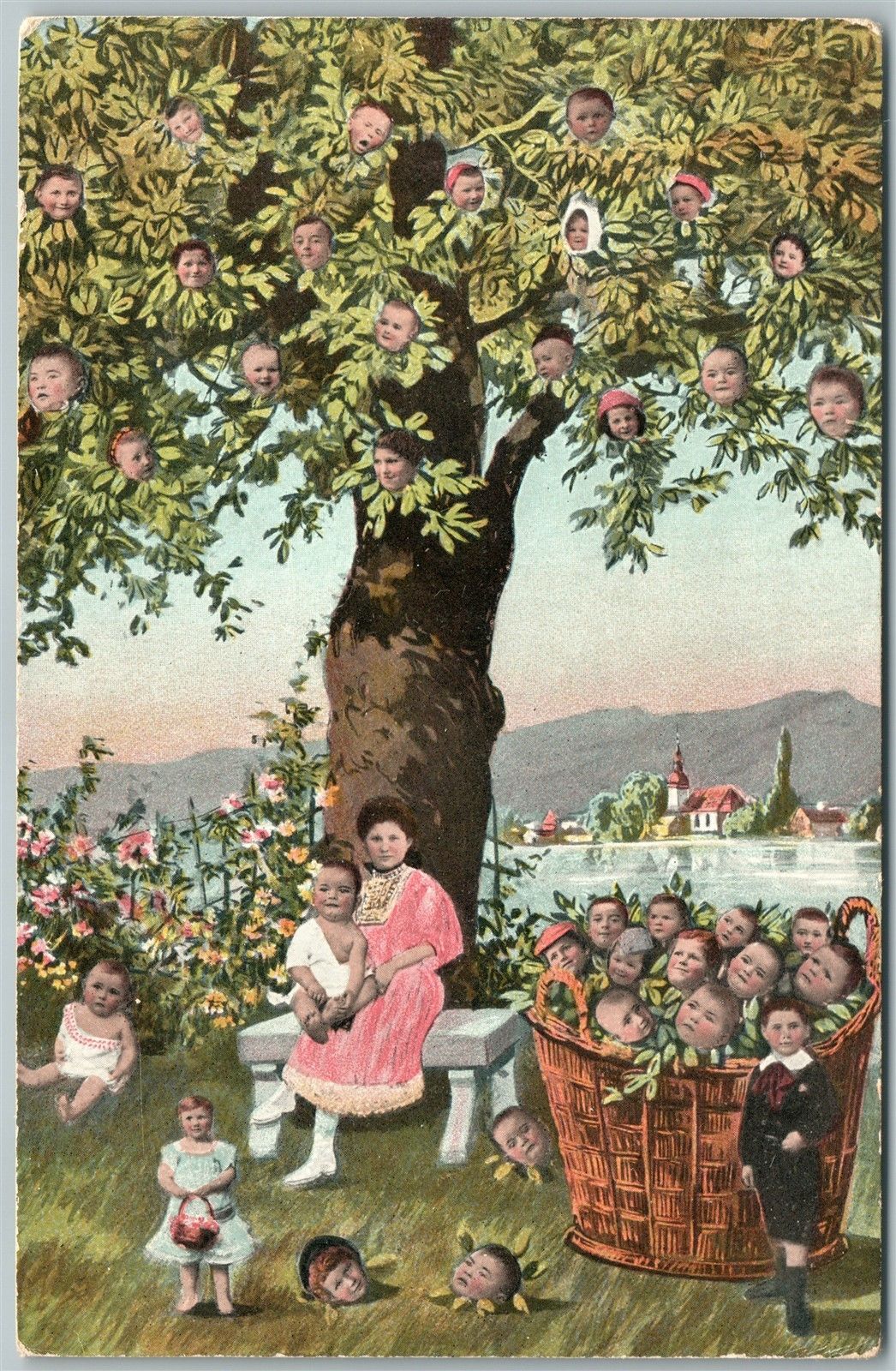 MULTIPLE BABIES in TREE SHADE ANTIQUE POSTCARD