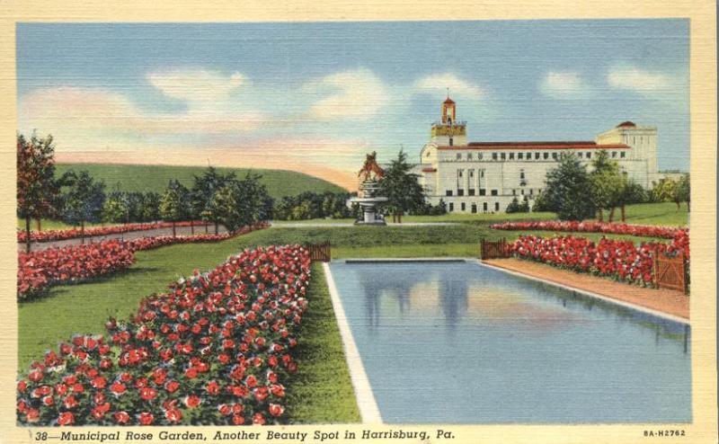 Municipal Rose Garden - Harrisburg, Pennsylvania. Standard sized linen post card. The Curt-Teich Dating Guide assigns 8A-H2762 to 1938. Very good condition.