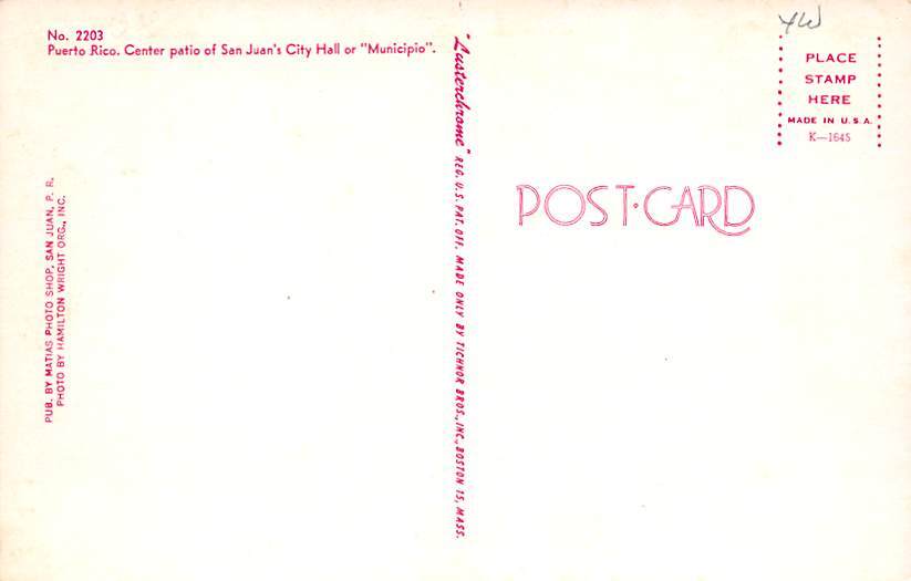 Municipio Puerto Rico Postcard, Grade: 1 Size: Regular Size Postcard - approximately 3 1/2 inch x 5 1/2 inch (9 CM x 14 CM) Grading Scale: Grade 1 = Perfect corners Grade 2 = Very Minimal corner wear, no crease ... Read More