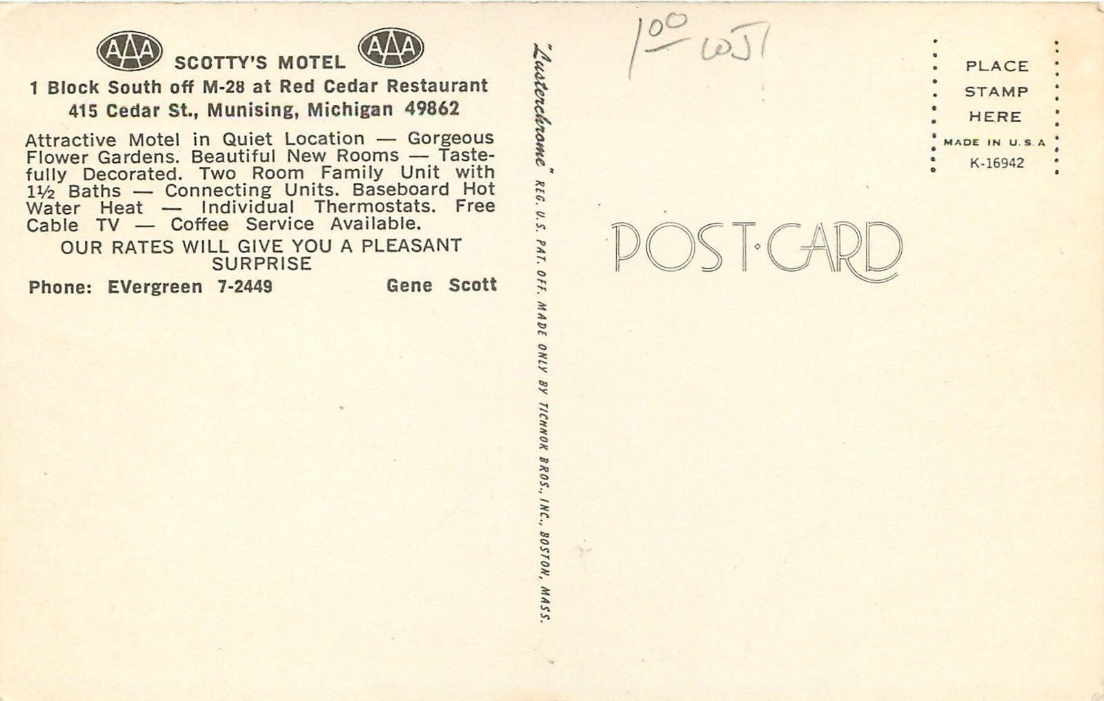 Munising Michigan~Scotty's Motel~Red Cedar Restaurant 1960 Postcard