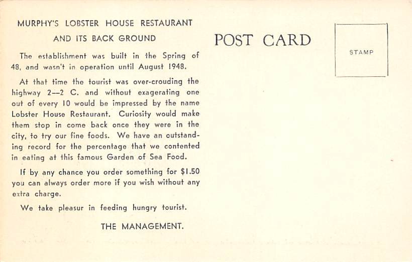 Murphy's Lobster House Restaurant Unused, Grade: 1, , Size: Regular Size Postcard - approximately 3 1/2 inch x 5 1/2 inch (9 CM x 14 CM) Grading Scale: Grade 1 = Perfect corners Grade 2 = Very Minimal corner we ... Read More