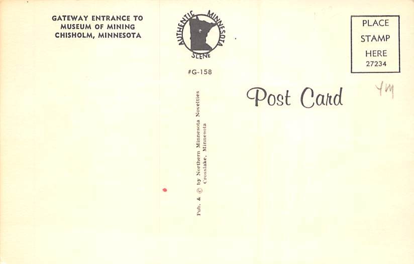 Museum of Mining Chisholm, Minnesota MN Postcard - Unused Grade: 1 Size: R - Regular size: Approx 3 1/2 X 5 1/2 inch (9 cm X 14 cm) Grading Scale: Grade 1 = Perfect corners Grade 2 = Very Minimal corner wear, ... Read More