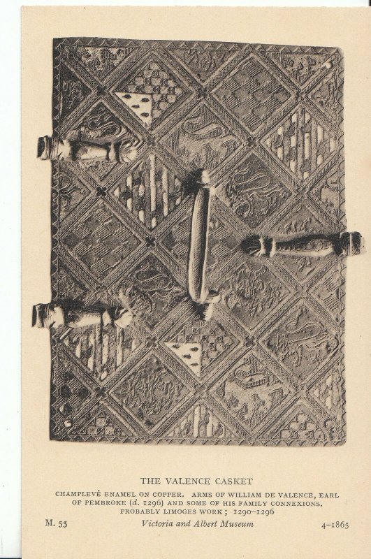 Title: Museum Postcard - The Valence Casket - Champleve Enamel on Copper - Armsof William De Valence, Earl of Pembroke Publisher: Victoria and Albert Museum Postally Used: Unused Defect(s): If a postcard has any sig ... Read More