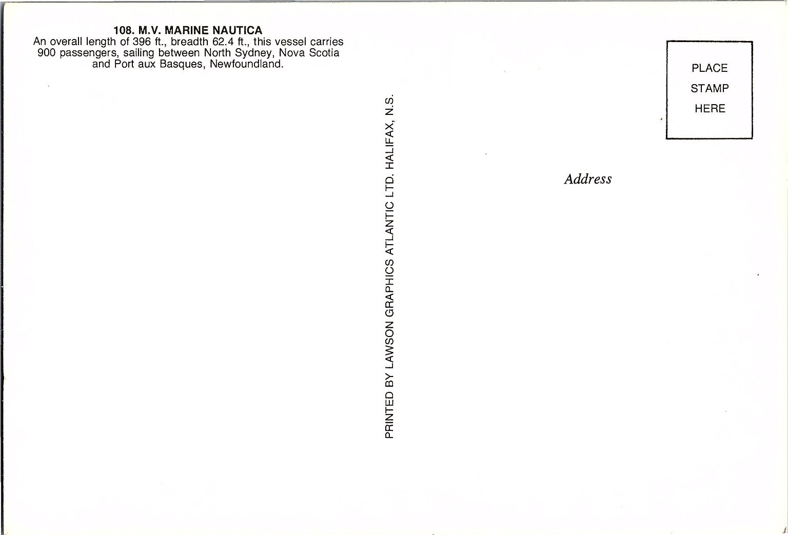 This vintage postcard features the M.V. Marine Nautica, a passenger vessel with an overall length of 396 feet and a breadth of 62.4 feet. The ship is depicted docked at port, highlighting its impressive size and design. Known for carrying 900 passengers, the Marine Nautica sailed routes between North Sydney, Nova Scotia, and Port aux Basques, Newfoundland, making it a significant vessel in Canadian maritime history.Printed by Lawson Graphics Atlantic Ltd. in Halifax, Nova Scotia, this postcard is a licensed reprint produced using lithograph printing techniques. It measures a continental size of approximately 6 x 4 inches, making it a collectible item for enthusiasts of boats, ships, and maritime memorabilia. The clean back includes a brief description of the vessel and a designated space for postage, enhancing its appeal for collectors and history buffs alike.