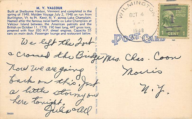 MV Valcour Lake Champlain Transportation Co. Ship Postcard ,