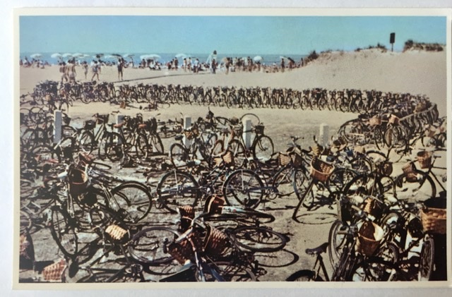 Beach scene at Jetties Beach on Nantucket Island: bikes on the crowded beach. In very good to excellent condition. Dates from the 1990s.