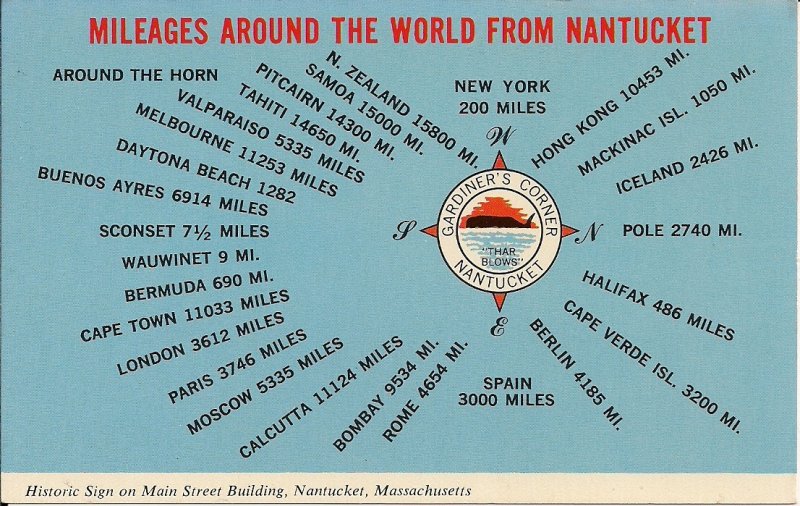 Nantucket MA 1972 Mileage Chart Compass, Gardiner's Corner, Massachusetts