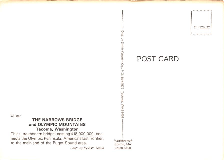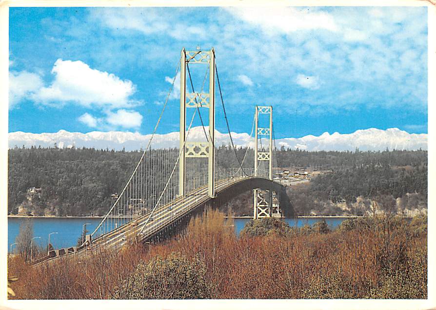 Narrows Bridge & Olympic Mountains - Tacoma, Washington, USA Grade: 3 Category: Continental Size Postcard, Approx 4 in x 6 in (10 cm x 15.25 cm) Product Size: Continental size: 4X6 inches (10.5 cm x 15 cm) Grad ... Read More