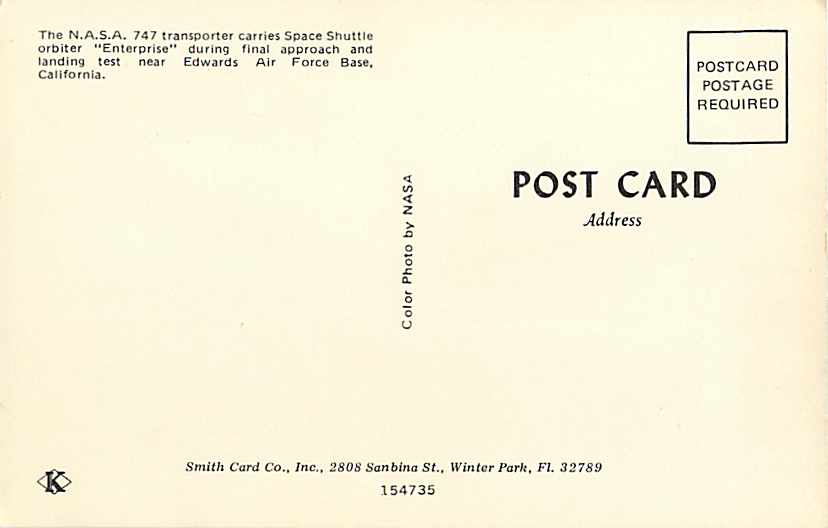 N.A.S.A. 747 Carries Space Shuttle Obiter Enterprise Chrome ....... Postcard Size: 3 1/2 BY 5 1/2 INCHES...... Type of Postcard: Chrome..... Postmark: Not Mailed..... Condition: Very Good: minor wear ..... ... Read More
