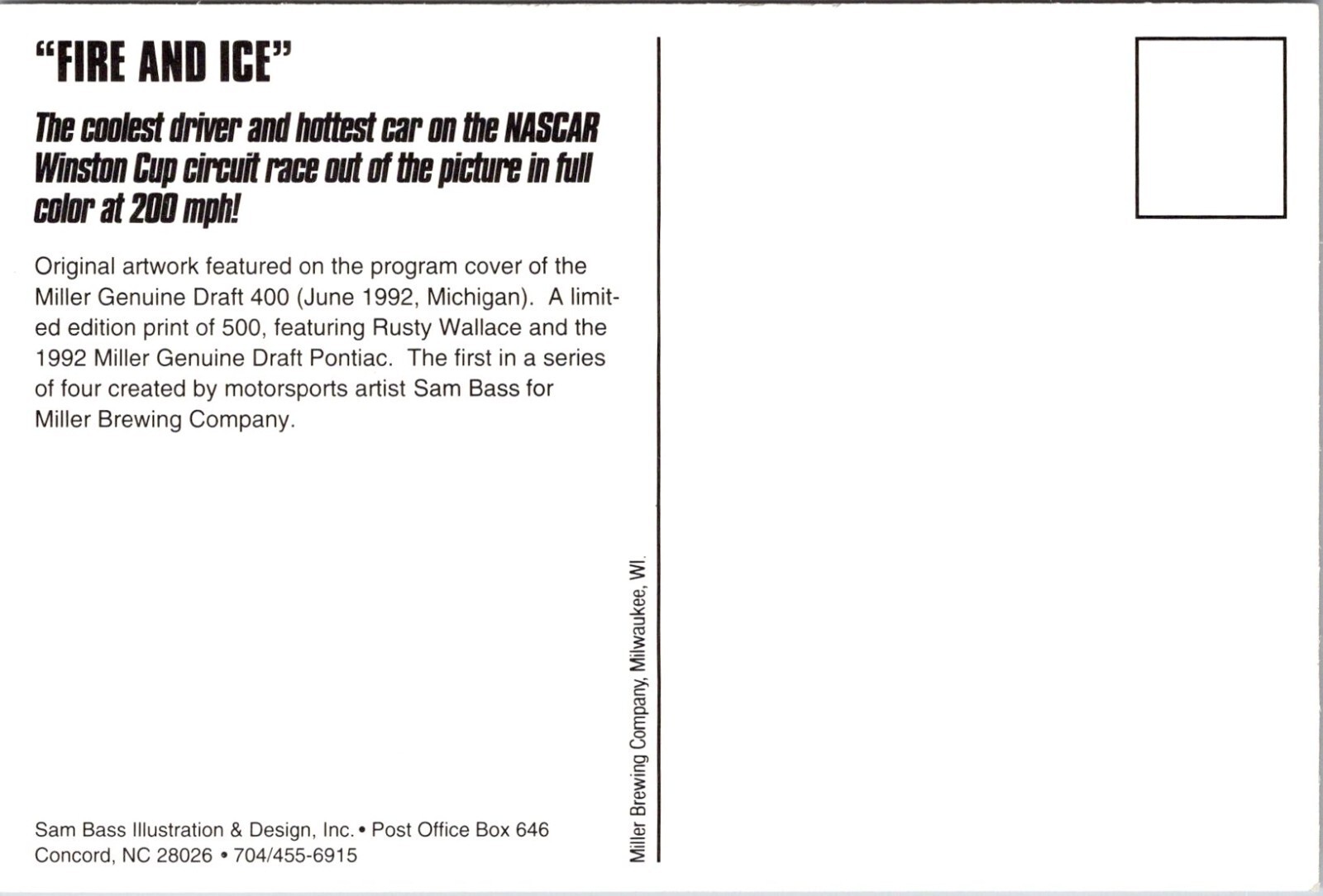 NASCAR Rusty Wallace Miller Genuine Draft Car c1992 Postcard Z21
