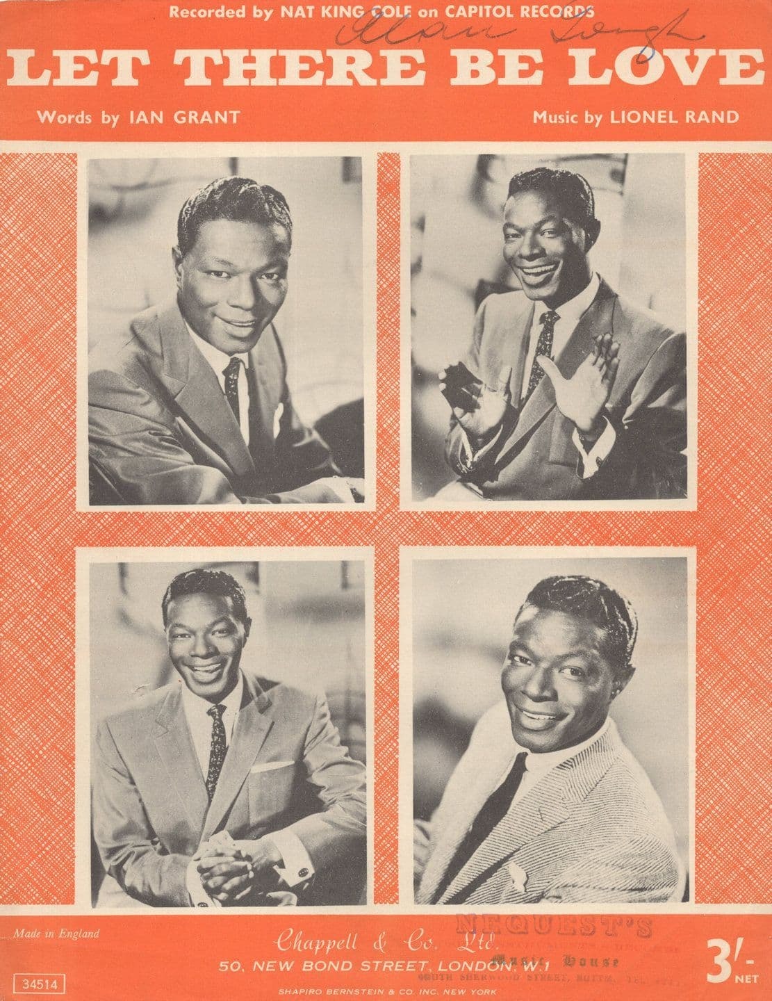 -SM- A vintage first edition sheet music UK score for Nat King Cole and his hit Let There Be Love with name on cover and lightly aged but great condition on Chappell London publishers when the record first climbing the charts and beautiful clean score with great character photo cover of Nat King Cole too.