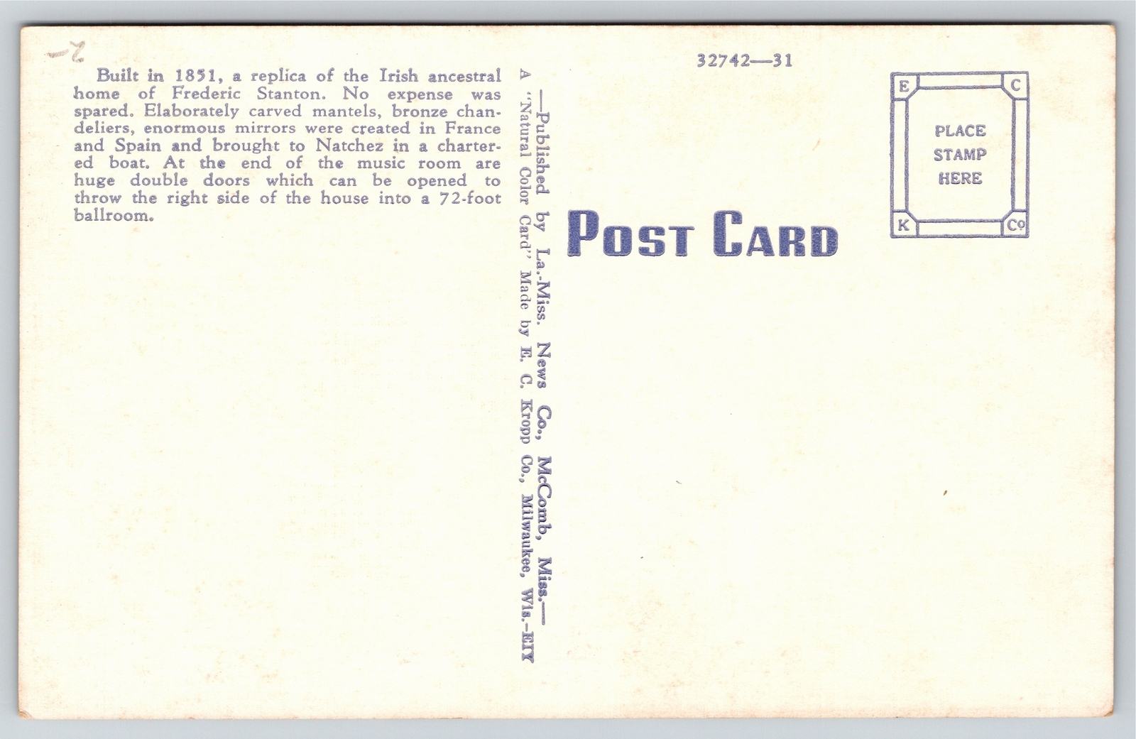Natchez Mississippi~Stanton Hall~Vintage Linen Postcard
