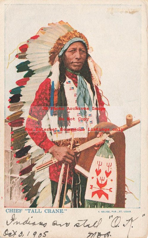 Native American Indian Tall Crane Holding Peace Pipe Product Photo Click Image for Larger Preview Product Information This is a nice vintage early printed postcard showing Native American Indian Tall Crane Holding P ... Read More