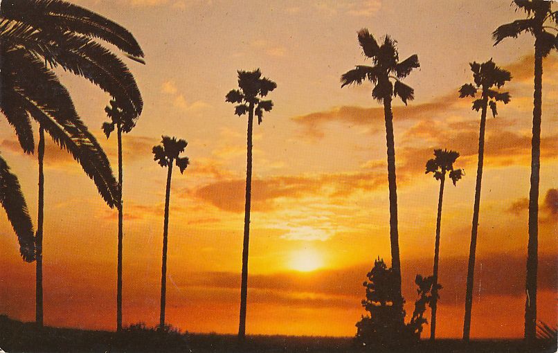 Native Palms the a Gorgeous Southern California Sunset. Standard sized chrome card. The Curt-Teich Dating Guide assigns 5C-K949 to 1955. Very good condition.
