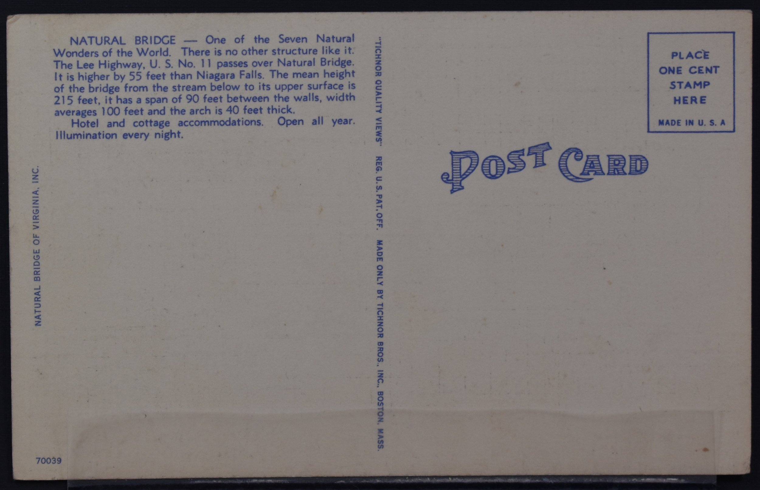 Standard size US postcard. See scans. [0079]My scans may show a small piece of plastic that is not part of the card on one edge, it is there to prop the card up as I get photos of it. I ship your card in between two pieces of custom cut thin cardboard to make sure you get your card just like it shows in the scans. See my feedback here and on that other site, lots of folks are very satisfied with how I get you your card.