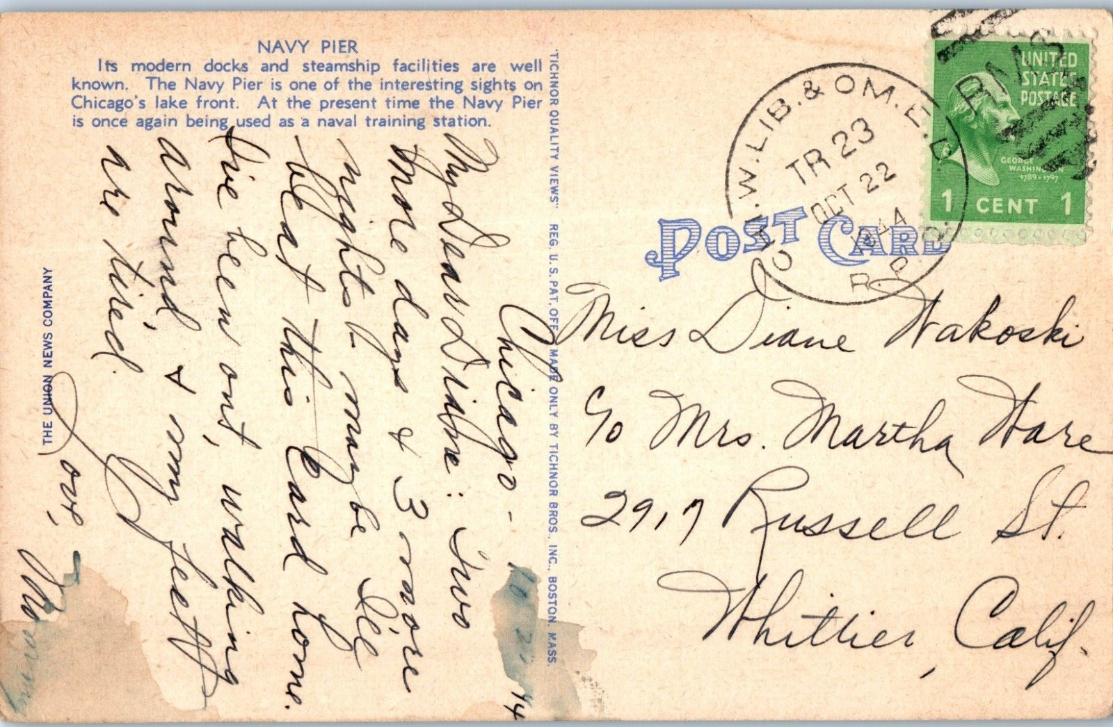 Condition: Pre-owned. Stored well. Slight edgewear, typical. Navy Pier Chicago Illinois Postcard Posted 1944