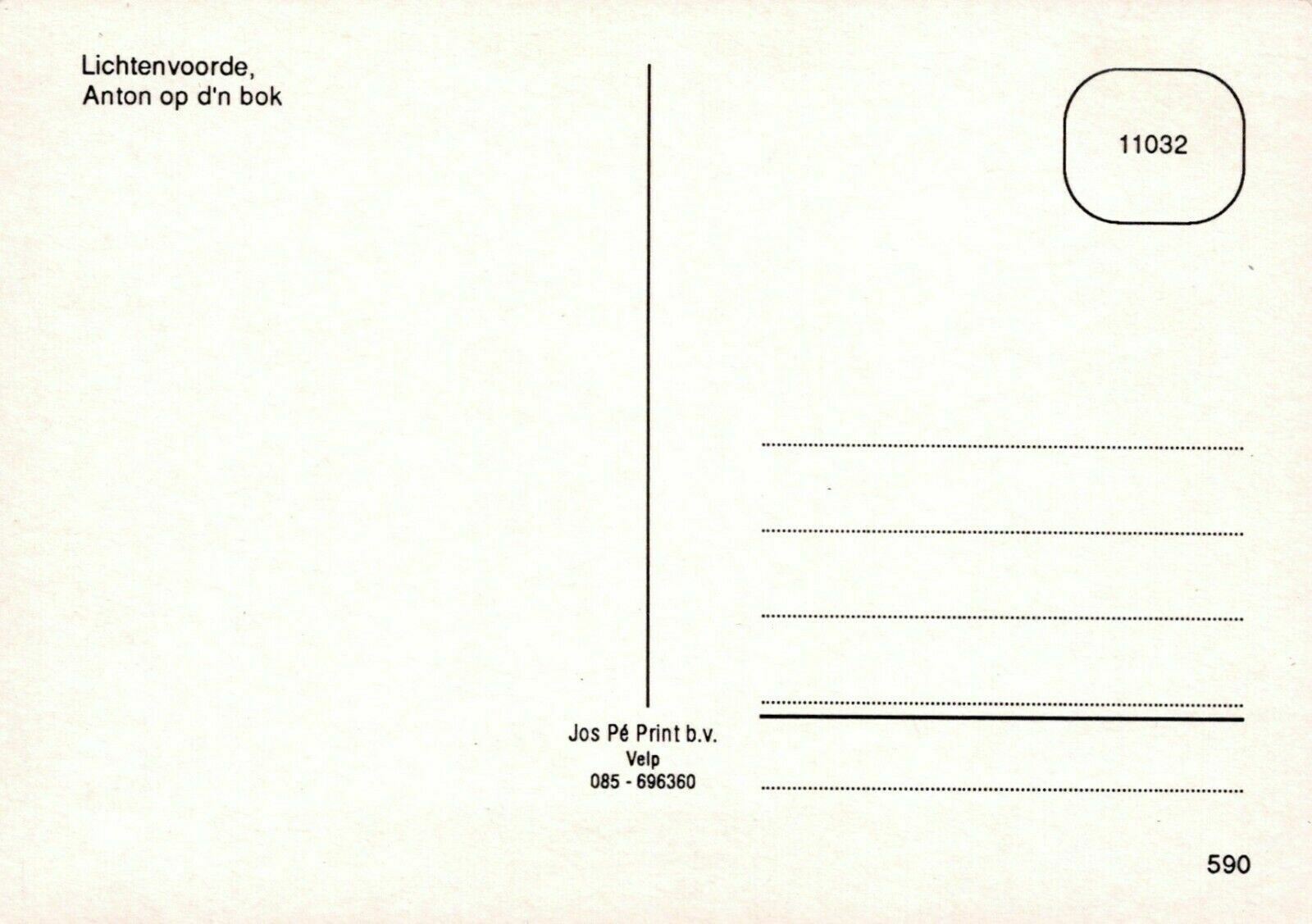 Mo's Postcards Postcard Description: Netherlands Postcard - Lichtenvoorde - Anton Op D'n Bok Defect(s): Postage & Payment: For U.K residents the quoted P & P fee is for any number of postcards purchased at one time. Happy to quote for non UK residents. For multiple purchases please wait for an invoice Listing and template services provided by inkFrog