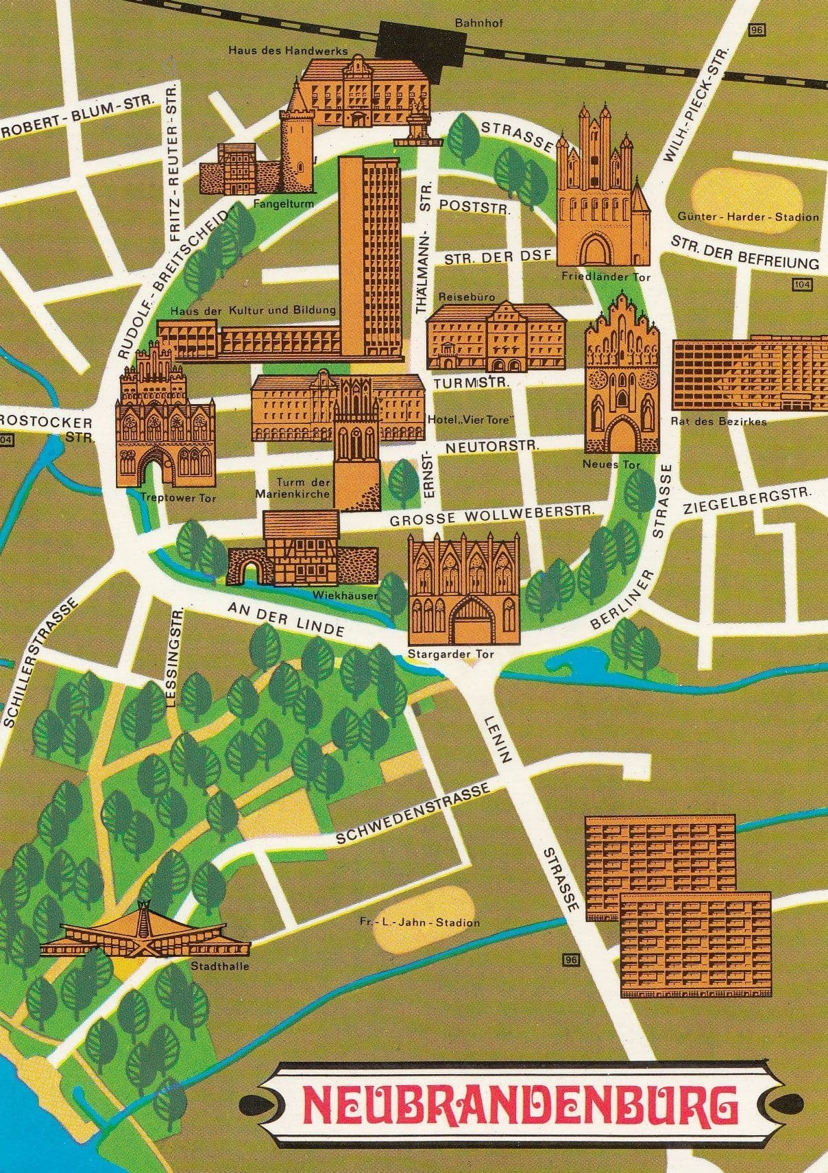 994 An undated but circa 1980s postcard of a map of Neubrandenburg with its main sights as miniature drawings and all its main road names in virtually mint condition unused too