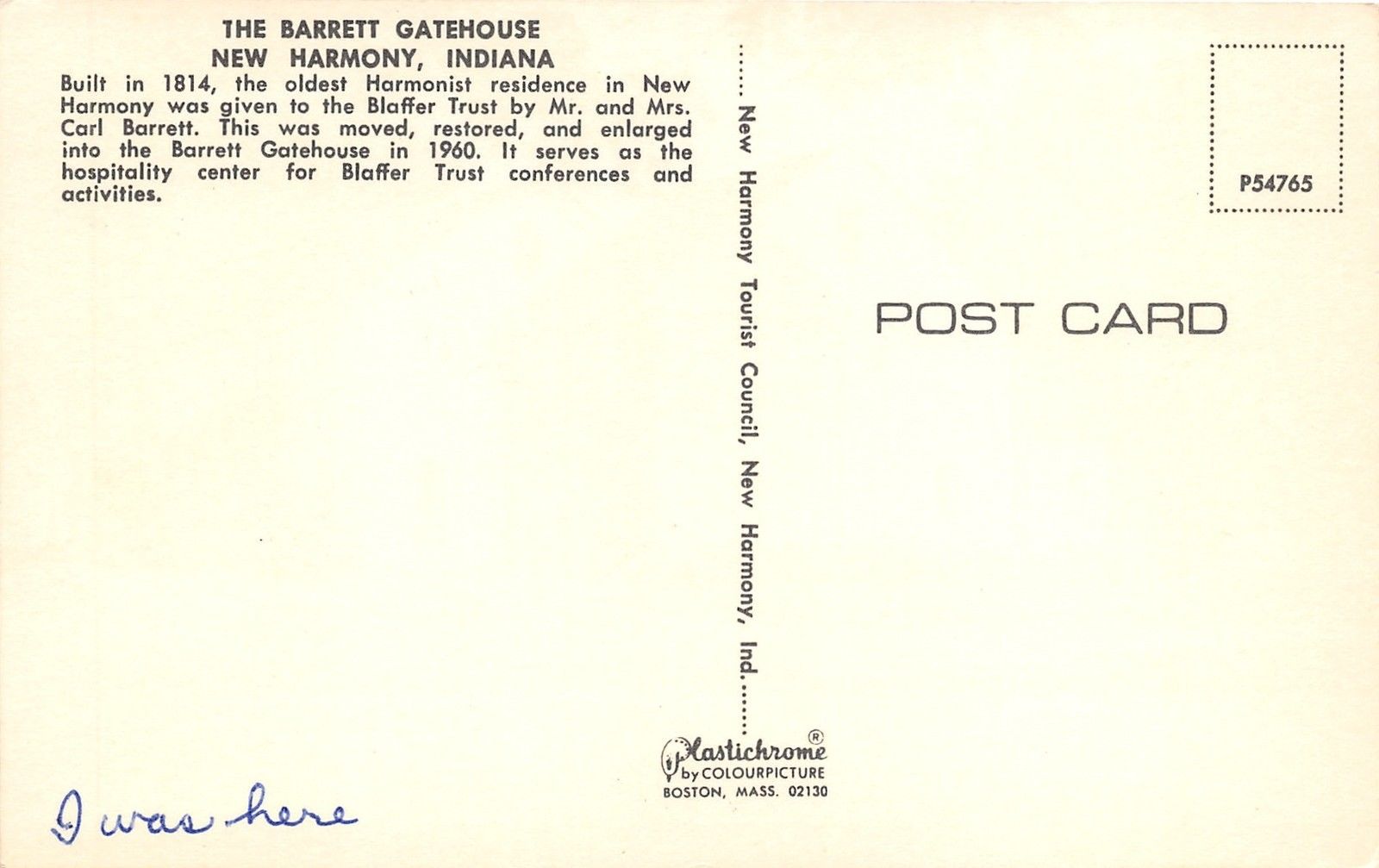 New Harmony Indiana~Barrett Gatehouse~Historical Info on Back~1960s Postcard