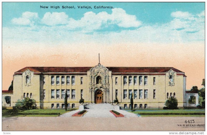 New High School, Vallejo, California, 1900-1910s :: Antique (Vintage) Original Postcard, Standard Size (3.5 by 5.5), Litho, EX.