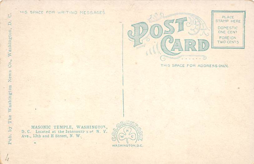 New Masonic Temple Washington DC Postcard - Unused Grade: 2 Size: R - Regular size: Approx 3 1/2 X 5 1/2 inch (9 cm X 14 cm) Grading Scale: Grade 1 = Perfect corners Grade 2 = Very Minimal corner wear, no crea ... Read More