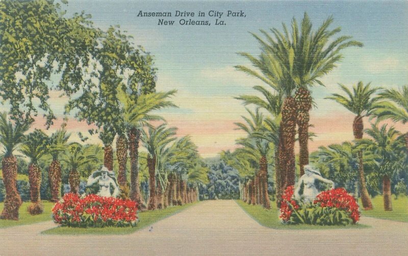 Condition: No major flaws. New Orleans LA Anseman Drive in City Park, Statues, Flowers Linen Postcard Ships fast.