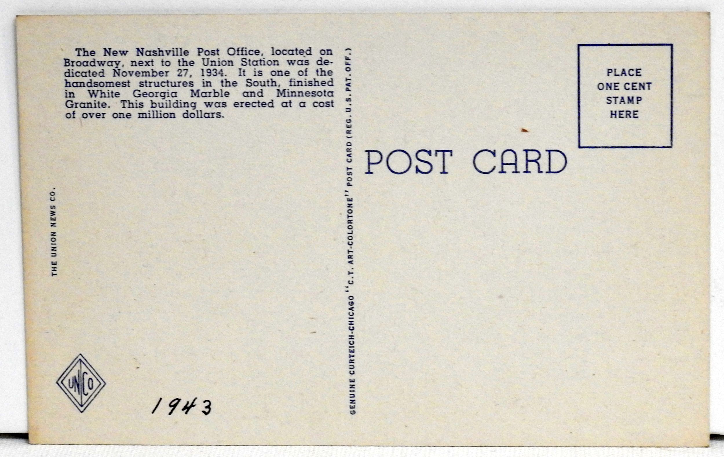 By Curt Teich for The Union News Co. #5A-H429. Secondary #4. Extremely clean. No bent corners or wear to edges. "1943" handwritten on the address side.