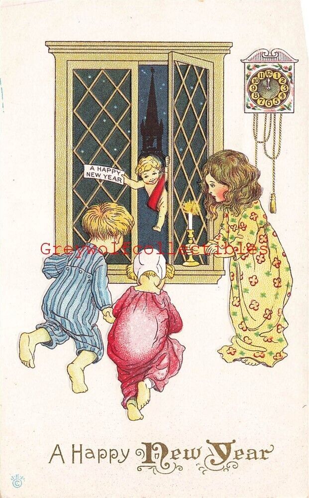 Early Printed Postcard New Year, Children Looking out Open Window, Clock Striking 12, Embossed Postmark: 191? Image: Nice and clean Corners: Light wear Faults/Other: