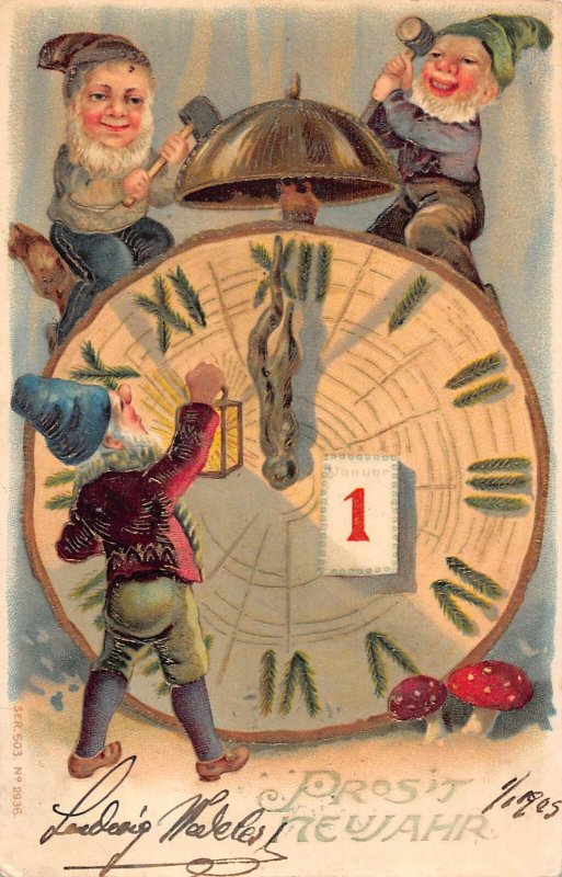 New Year Greetings 1905 Dwarf Midnight Clock Mushroom embossed postcard B992 This item is listed via xdm.it software