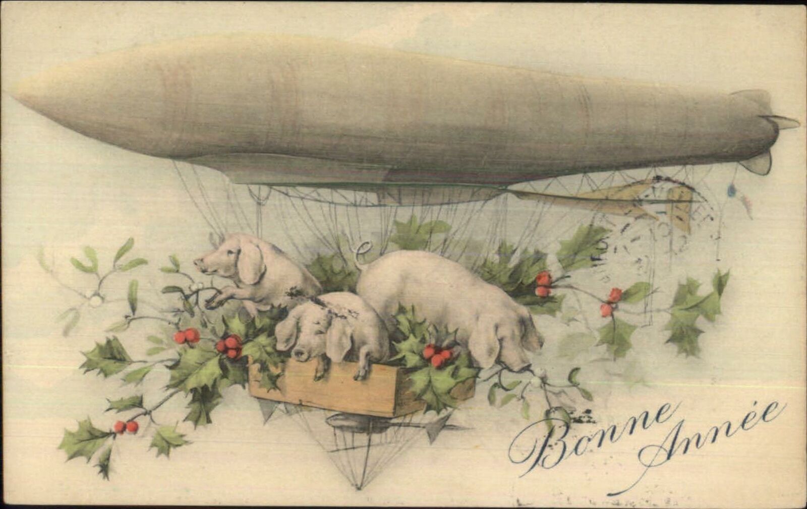 New Year Pigs Flying in Dirigible airship Fantasy c1910 Postcard