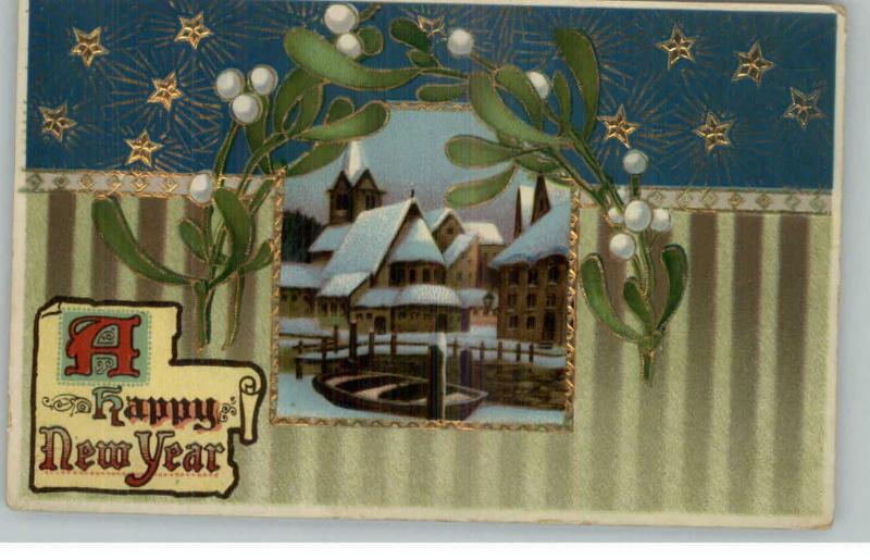 New Year - Village - Nice Gold Star Border - GEL c1910 Postcard