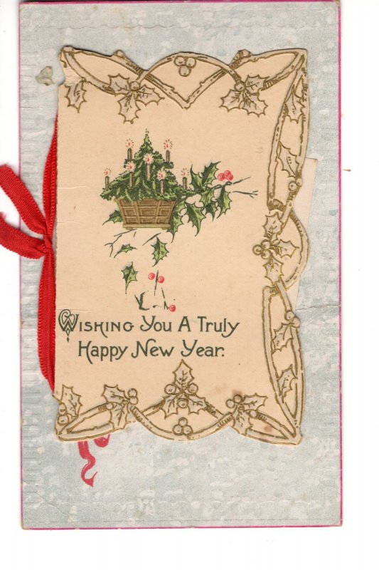 New Years Postcard with Ribbon, Unusual Fold Out
