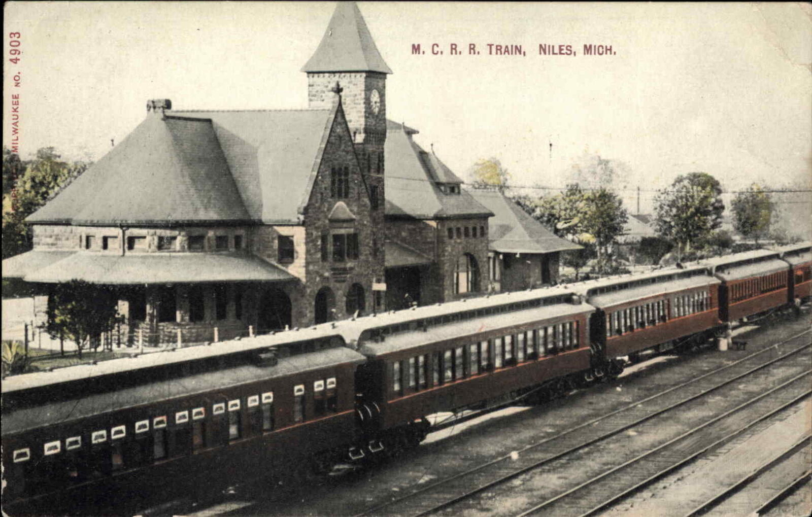 NILES MI MC Railroad Train and Station c1910 Postcard