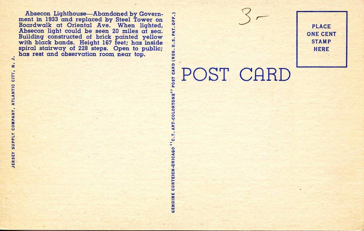 NJ - Atlantic City. Absecon Lighthouse --- * Grading of Postcards MINT (M): Perfect condition, no apparent blemishes, flaws, postally unused, may have some writing on back. NEAR MINT (NM): Like new, image is uncom ... Read More