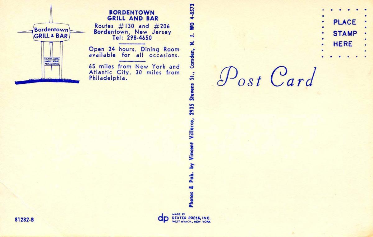 NJ - Bordentown. Bordentown Grill & Bar Grading of Postcards MINT (M): Perfect condition, no apparent blemishes, flaws, postally unused, may have some writing on back. NEAR MINT (NM): Like new, image is uncompromi ... Read More