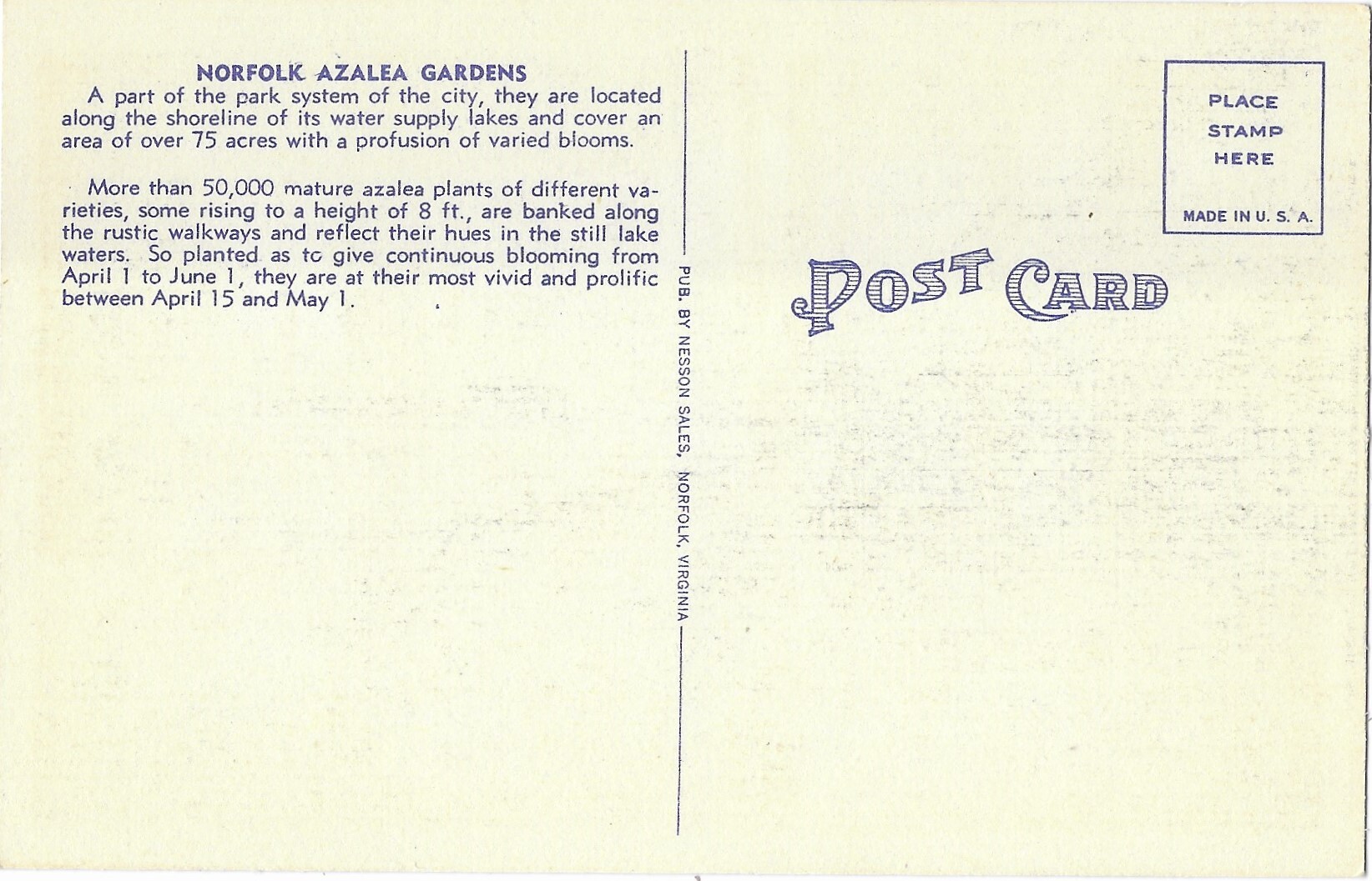 Norfolk Azalea Gardens, Norfolk Virginia. Nice history of gardens and facts about Azalea's printed on back side.Seller Information